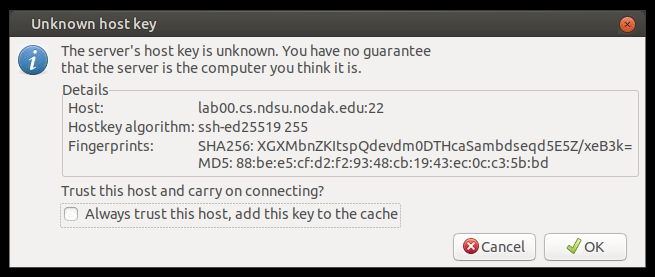 - Note: If you have never connected to the remote computer from your current computer, you man get an Unknown host key warning message.