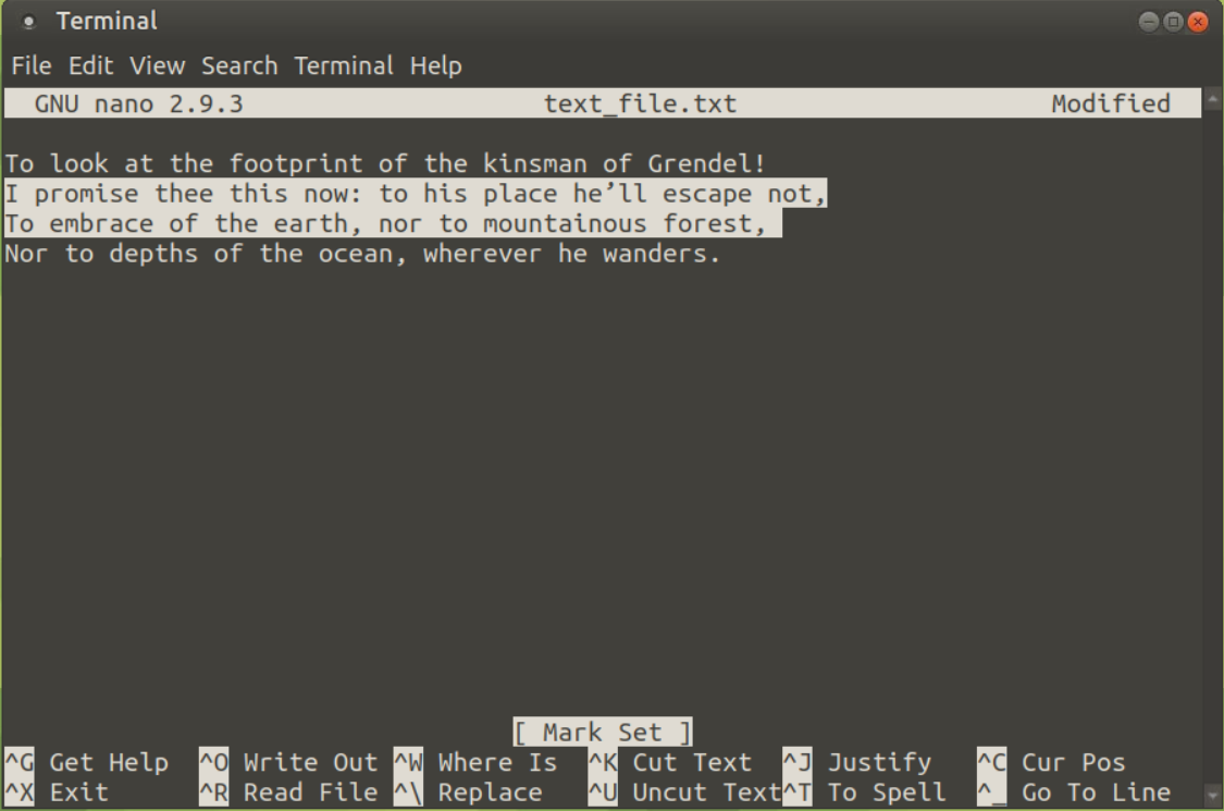 When we want to copy text in graphical environment, we highlight it with the cursor. Similarly, in nano we “mark” it by using the Ctrl+^ command. You simply move the cursor to where you want to start marking, and then you hit Ctrl+^ to “set” it. This will mark everything between the starting point up to and NOT including the cursor.