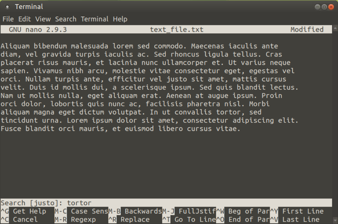 Program functions in Nano are referred to as “shortcuts”, such as saving, quitting, justifying, etc. The most common ones are listed at the bottom of the screen, but there are many more that aren’t.