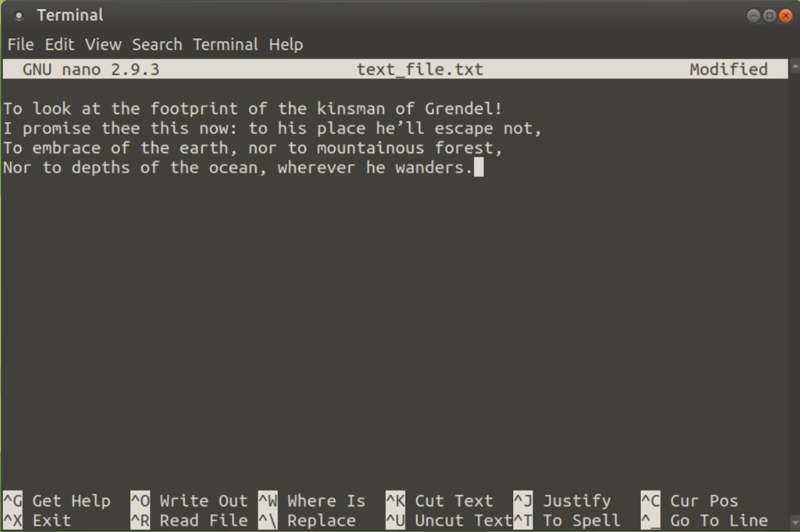 Nano is a WYSIWYG editor; “what you see is what you get.” What you type directly goes into the text input, unless you modify it with a key like Control or Meta. It’s pretty simple, so type some text out, or copy something and paste it into your terminal.