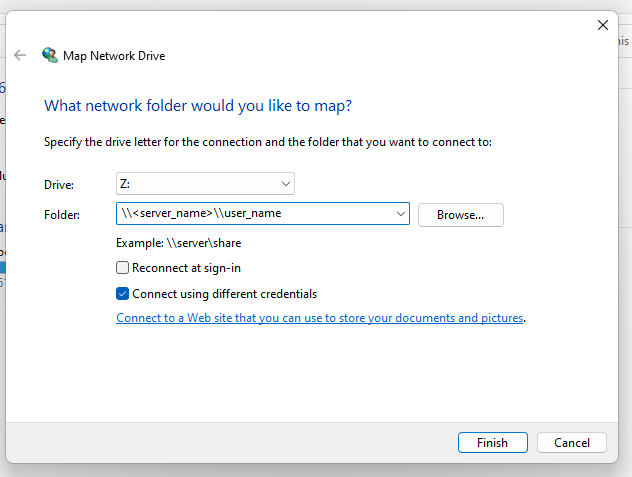 - Make sure the Connect using different credentials box is checked.