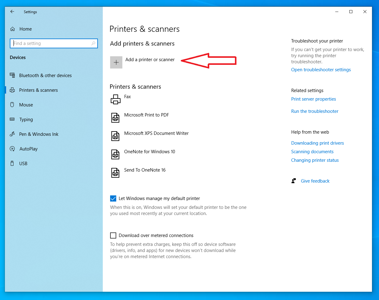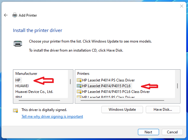 If windows returns a Install the printer driver dialog box without a Manufacturer listing for HP, you will need to use windows update. Note: Windows update can take a long time 5-10 minutes to update driver list.