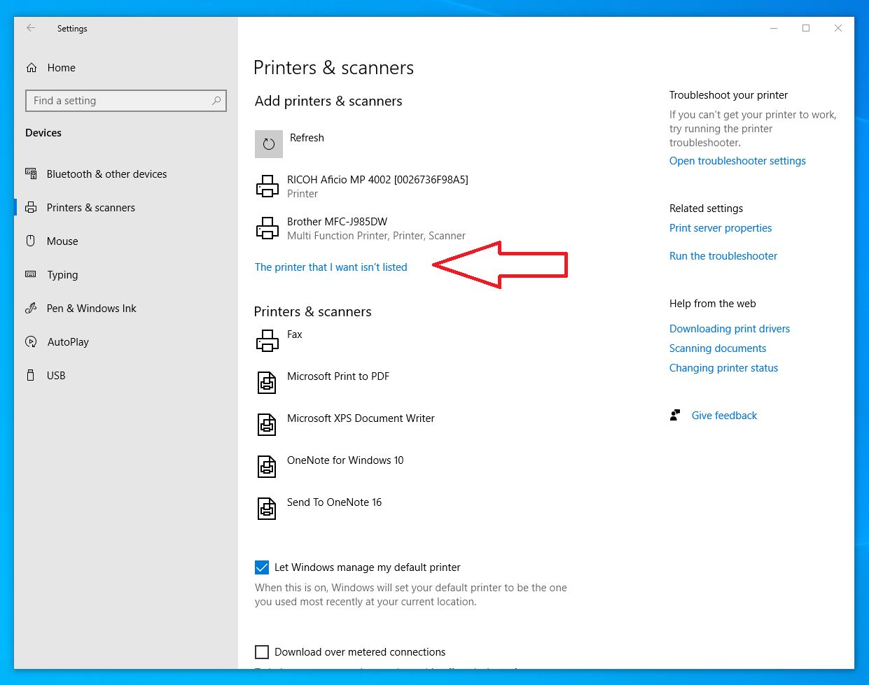 Step 5: Most likely, Windows 10 won't be able to see the printer, so choose 'The printer that I want isn't listed'.
